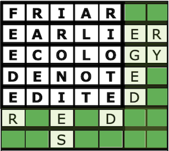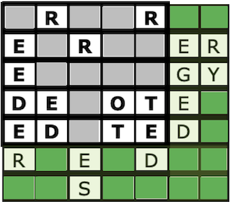 WordaXity is a little like Hangman, but is played in two dimensions. Use the keyboard below the puzzle to make (educated) guesses about what letters might fill every GREY grid square, making horizontal AND vertical words. Every instance of that letter will be filled in upon selection. (If you make an accidental selection, your browser's "back" button will take you one or more steps back.) The empty dark green squares are not in play, and the light green squares (and their in-play lettersquares) are our gifts to you.